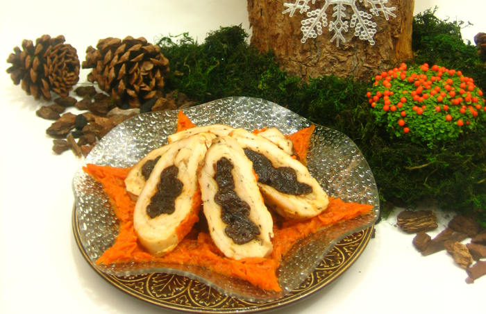 - На кожнае філе пакласці 5-6 шт. чарнасліву, звярнуць філе ў рулецік і скалоць зубачысткаю.
