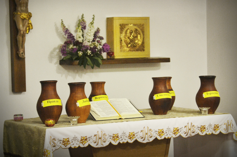 Цуд у Кане Галілейскай. Марыя не ўказвае Сыну, што рабіць і ў якім парадку, Яна проста агучвае праблему — дзеці вучацца расказваць пра свае цяжкасці Езусу, давяраць Яму. Для дзяцей падрыхтаваны сапраўдныя гліняныя збаны, на іх наклеены словы «Любоў», «Радасць», «Цярпенне», «Праўда», «Вернасць» і іншыя. Толькі Бог можа напоўніць нас сапраўднаю любоўю, радасцю, адарыць цярпеннем і праўдаю, толькі Ён можа напоўніць нашыя «збаны». Мы задумваемся, чаго нам не стае з гэтых дароў. А лісткі са саваім іменем апускаем у той збан, на якім напісана, чаго мы больш за ўсё хочам прасіць у Езуса. На вячэрнім Ружанцы мы молімся аб гэтых дарах для кожнага.