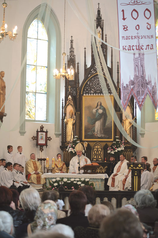 Падчас Імшы мітрапаліт звярнуўся да прысутных з пранікнёным казаннем. Між іншым арцыбіскуп адзначыў: «Езус кажа: калі вы будзеце маўчаць, прамаўляць будуць камяні. І яны прамаўлялі доўгія дзесяцігоддзі. Касцёл стараліся схаваць, але нельга было схаваць веру. Людзі добра ведалі, што знаходзіцца за сценамі новага будынка. Калі часы змяніліся, яны мужна клапаціліся аб вяртанні святыні парафіі. І так сталася, хаця пабудаваны ў савецкія часы будынак па-ранейшаму закрывае касцёл і перашкаджае правядзенню набажэнстваў. Ужо даўно прыйшоў час вярнуць гістарычую справядлівасць і знесці гэты будынак, ад чаго з гістарычнага погляду выйграў бы і горад, і яго жыхары, і госці, асабліва ў перспектыве надыходзячага чэмпіянату свету па хакеі».
