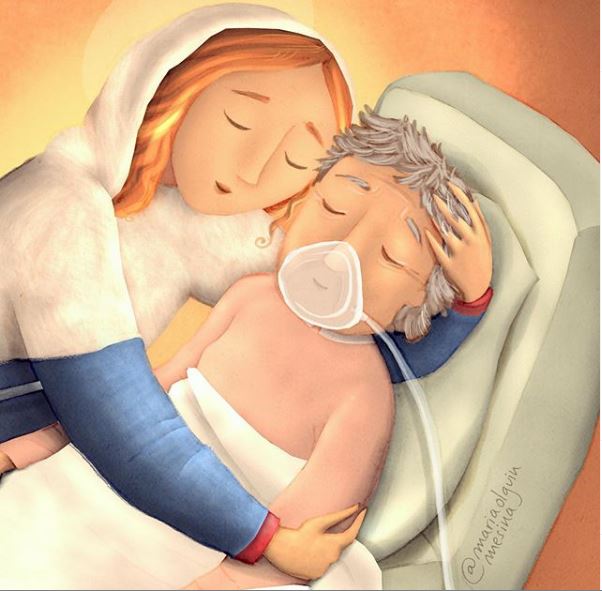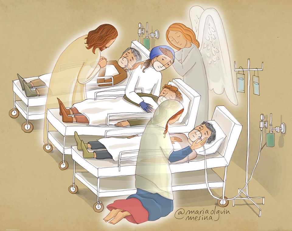 «Не, яны не адзінокія! Давайце маліцца за іх. Уяўляю Дзеву Марыю, якая праходзіць па шпіталі і па-мацярынску клапоціцца пра кожнага хворага. Уяўляю Анёлаў Ахоўнікаў, якія асвятляюць давераных ім людзей. Уяўляю Езуса, нашага Збаўцу, які атуляе любоўю ўсіх хворых. Уяўляю св. Юзафа і ўсіх святых. Усіх не змясціць на гэтым малюнку! Колькі ж сюрпрызаў чакае нас у небе!»