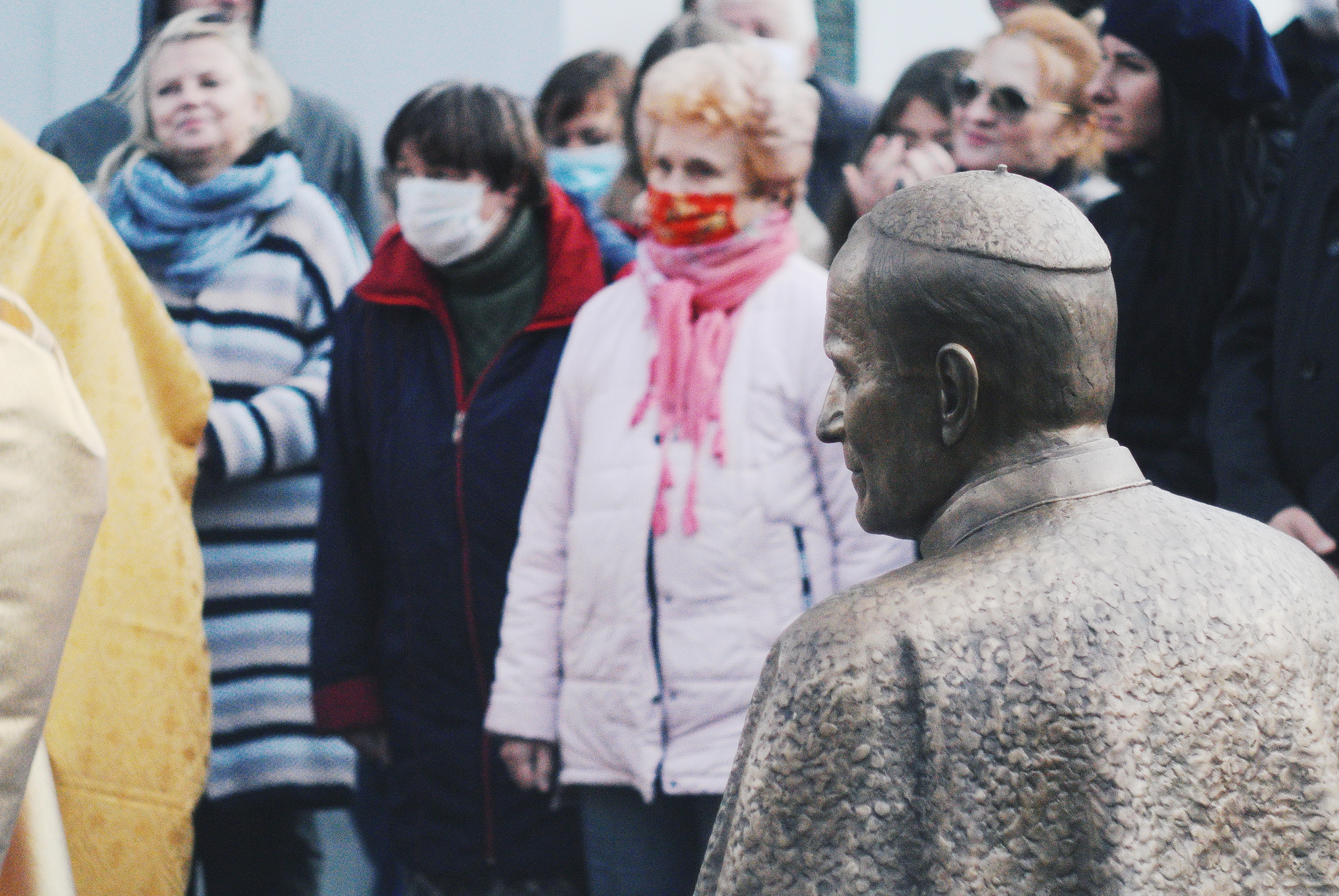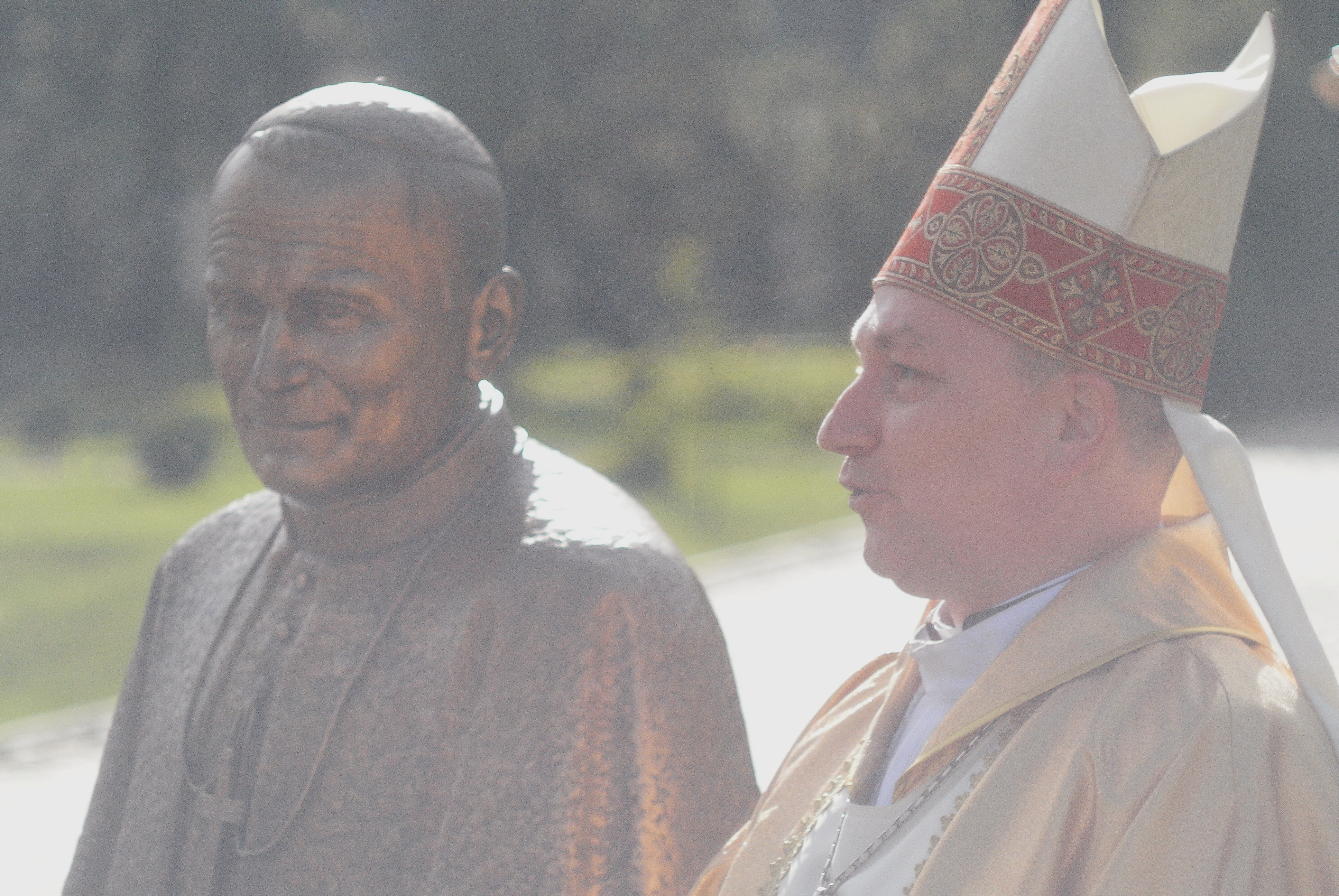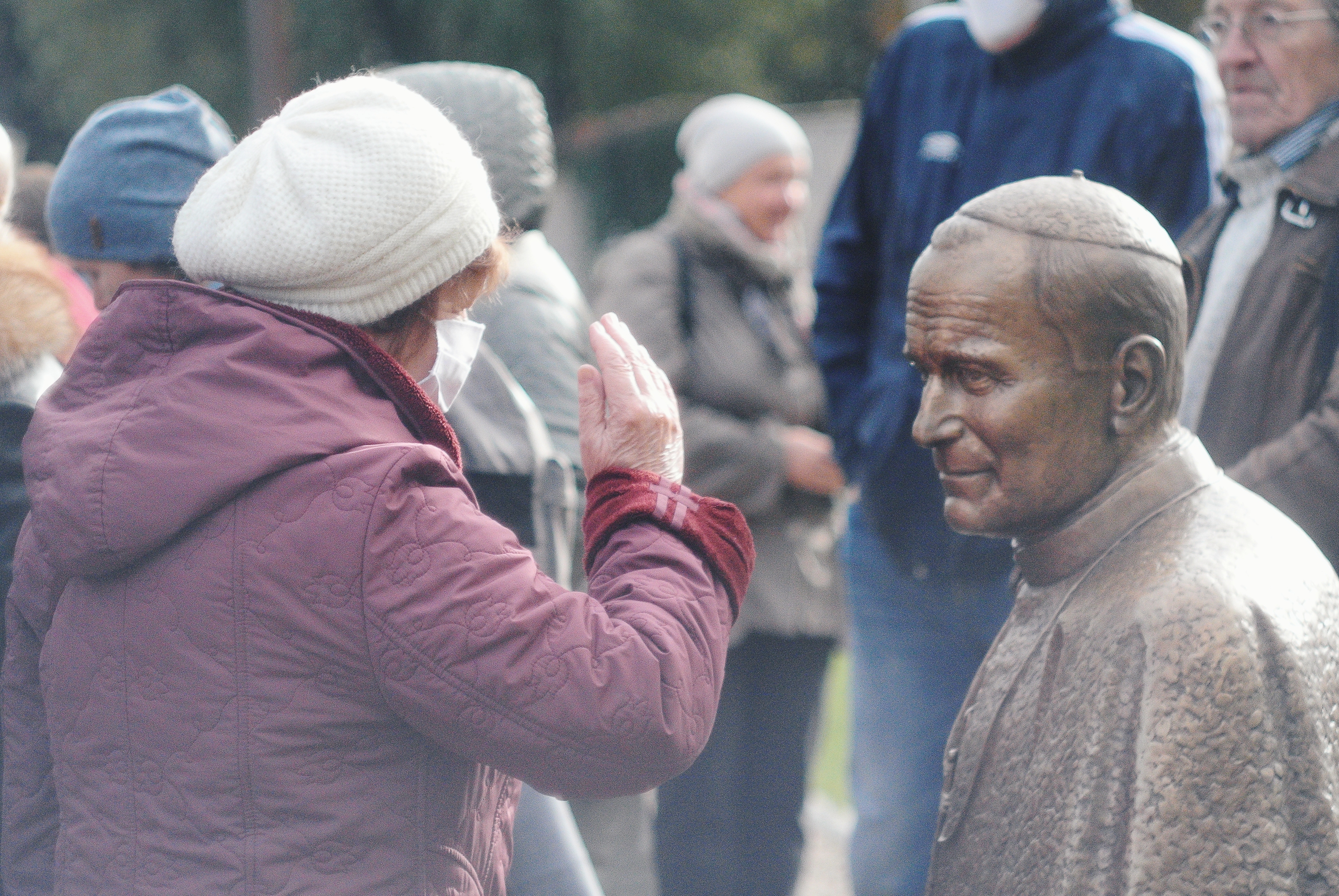 Дзень асвячэння фігураў адкладаўся некалькі разоў, бо мы яшчэ спадзяваліся на хуткае вяртанне нашага мітрапаліта, але, хіба невыпадкова, асвячэнне адбылося 19 кастрычніка, бо 16 кастрычніка была гадавіна абрання Яна Паўла ІІ на Святы Пасад, а 22 кастрычніка — літургічны ўспамін святога. Гэтая нядзеля стала добрай нагодаю, каб узгадаць Яна Паўла ІІ як вельмі блізкага для Беларусі чалавека, а таксама як унікальную асобу, якая змяніла свет. Сваімі ўспамінамі пра святога Папу шчодра дзяліўся біскуп Юрый Касабуцкі падчас святой Імшы. Ён успамінаў тыя моманты, калі трапляў на сустрэчы з папам Янам Паўлам ІІ, хоць гэта былі вялізныя натоўпы людзей, але яго прысутнасць напаўняла ўсё вакол сябе Божай прысутнасцю. Біскуп у сваім казанні нагадваў пра найбольш папулярныя словы, вельмі важны пасыл святога Папы: «Не бойцеся! Адчыніце дзверы Хрысту!». Словы «Не бойцеся!» надзвычай важныя сёння і для нас, беларусаў! Біскуп Юрый запэўніў усіх прысутных у духоўнай лучнасці з намі мітрапаліта Тадэвуша, які перадаваў усім вернікам прывітанне і сваё благаслаўленне з выгнання.