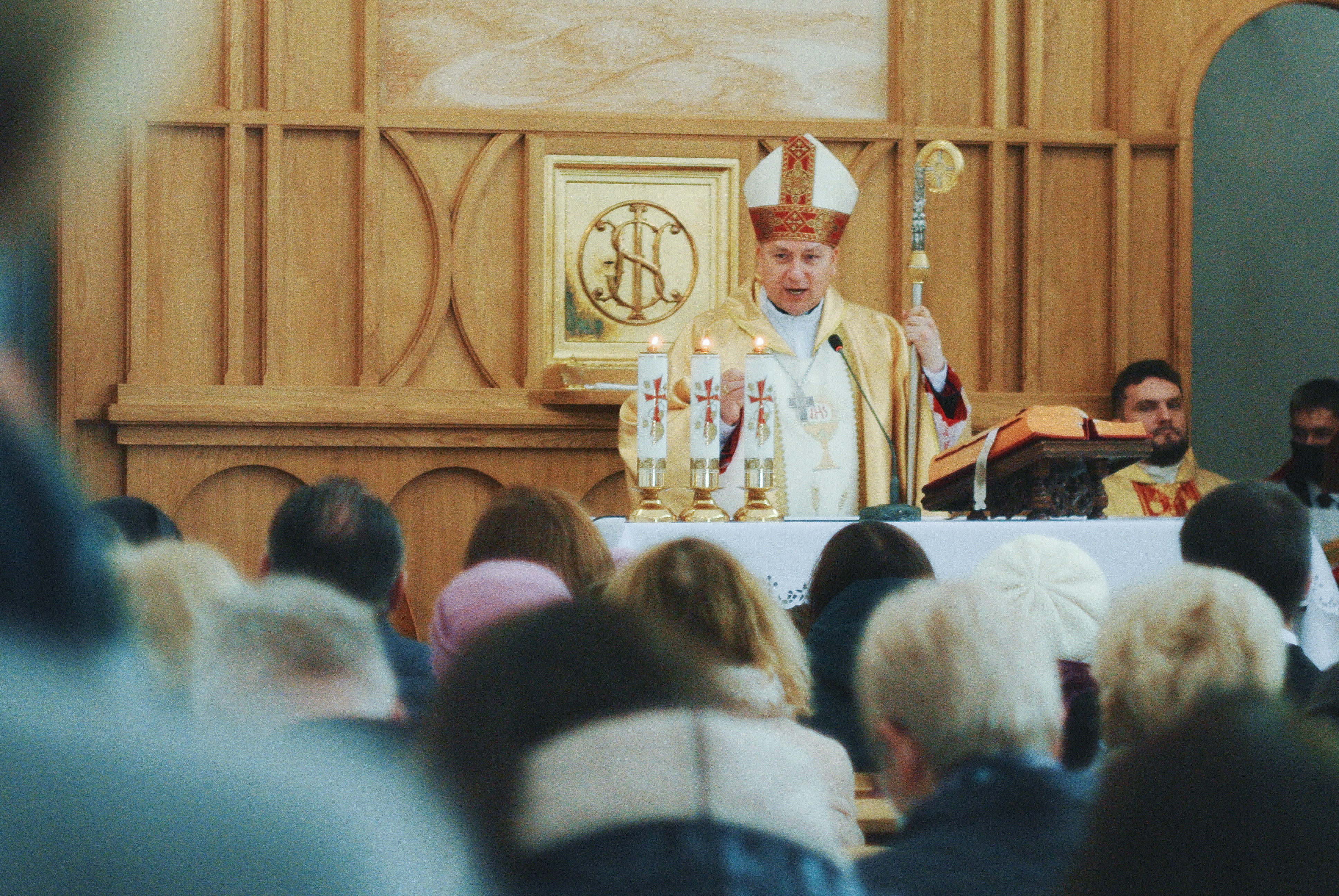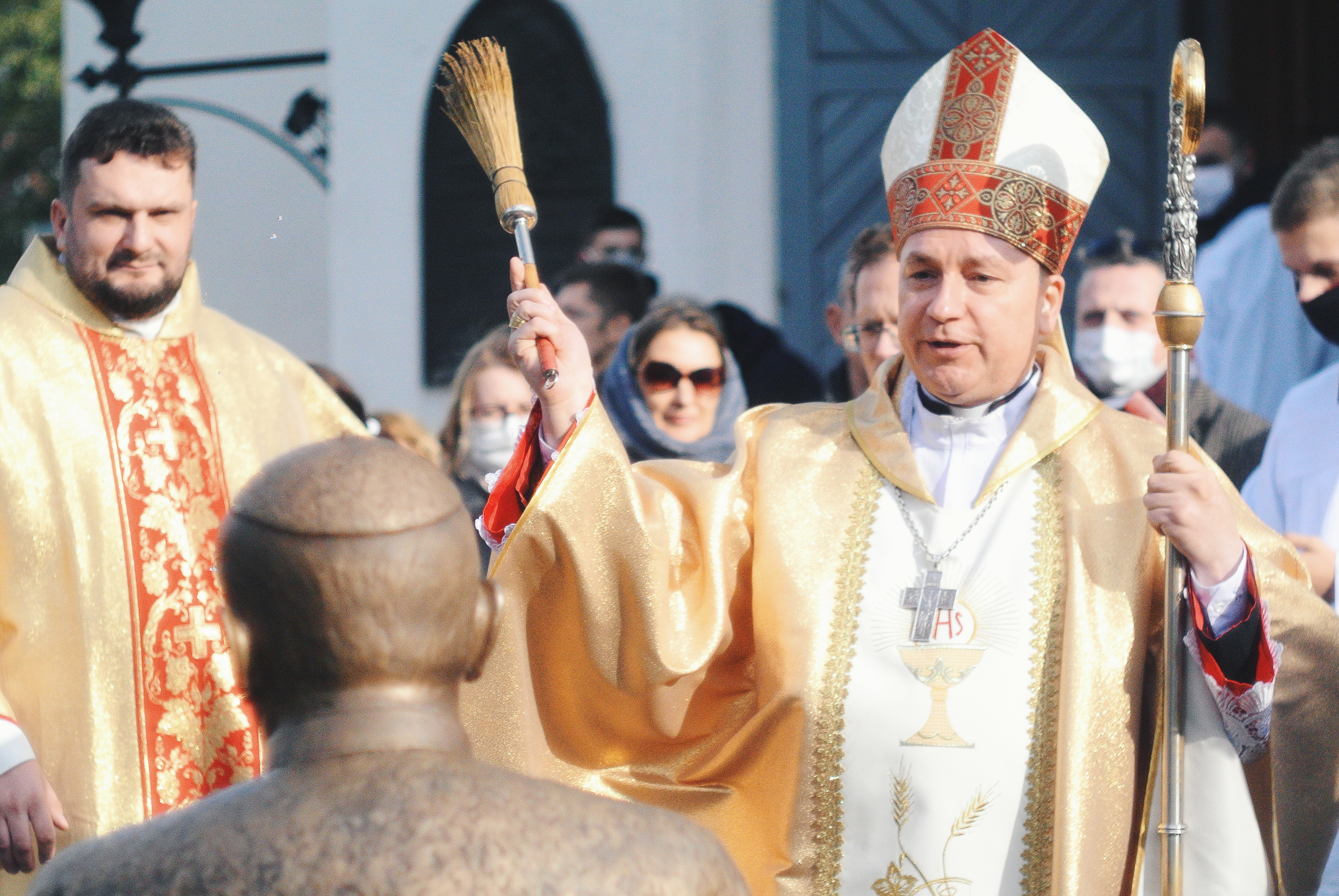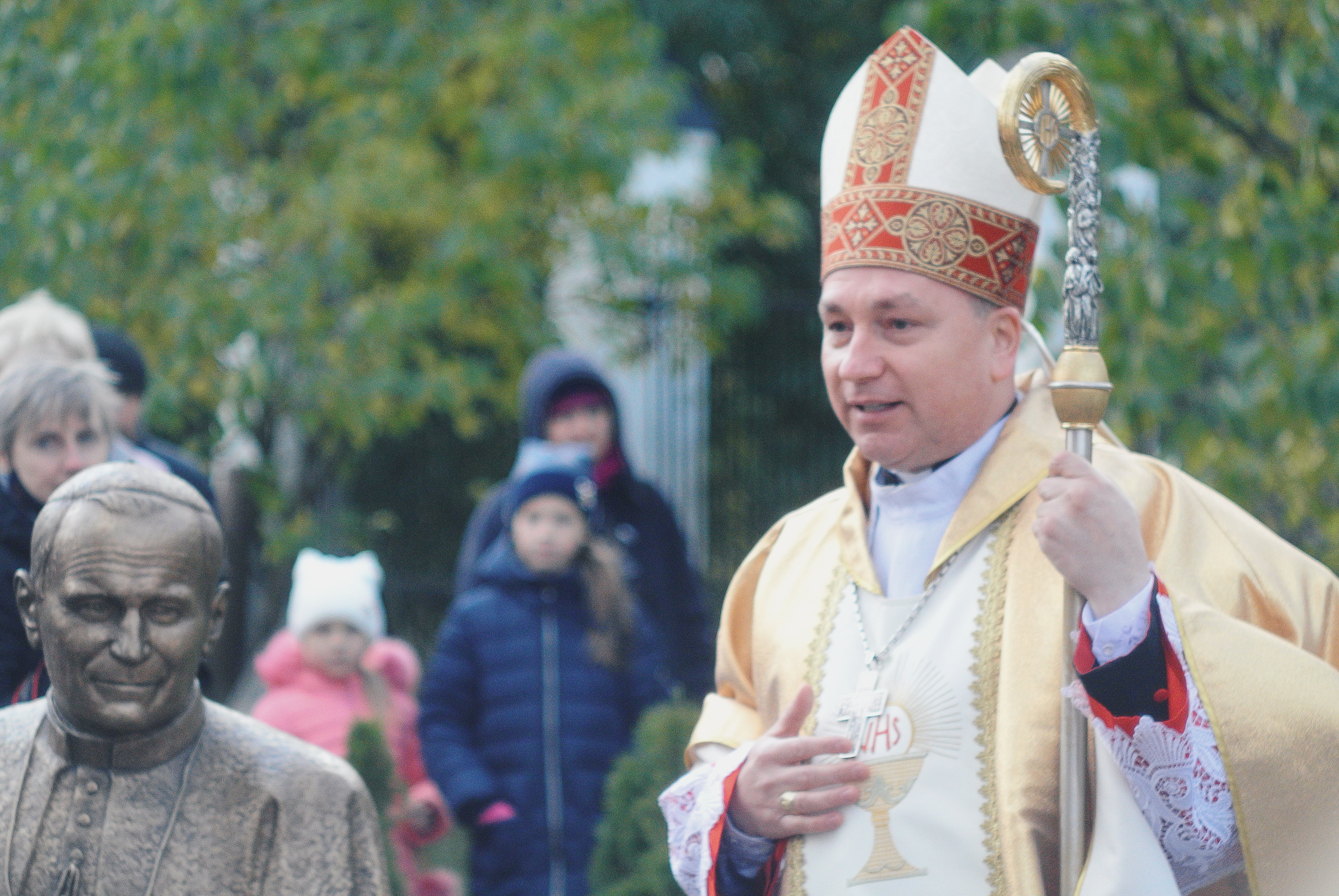 Дзень асвячэння фігураў адкладаўся некалькі разоў, бо мы яшчэ спадзяваліся на хуткае вяртанне нашага мітрапаліта, але, хіба невыпадкова, асвячэнне адбылося 19 кастрычніка, бо 16 кастрычніка была гадавіна абрання Яна Паўла ІІ на Святы Пасад, а 22 кастрычніка — літургічны ўспамін святога. Гэтая нядзеля стала добрай нагодаю, каб узгадаць Яна Паўла ІІ як вельмі блізкага для Беларусі чалавека, а таксама як унікальную асобу, якая змяніла свет. Сваімі ўспамінамі пра святога Папу шчодра дзяліўся біскуп Юрый Касабуцкі падчас святой Імшы. Ён успамінаў тыя моманты, калі трапляў на сустрэчы з папам Янам Паўлам ІІ, хоць гэта былі вялізныя натоўпы людзей, але яго прысутнасць напаўняла ўсё вакол сябе Божай прысутнасцю. Біскуп у сваім казанні нагадваў пра найбольш папулярныя словы, вельмі важны пасыл святога Папы: «Не бойцеся! Адчыніце дзверы Хрысту!». Словы «Не бойцеся!» надзвычай важныя сёння і для нас, беларусаў! Біскуп Юрый запэўніў усіх прысутных у духоўнай лучнасці з намі мітрапаліта Тадэвуша, які перадаваў усім вернікам прывітанне і сваё благаслаўленне з выгнання.