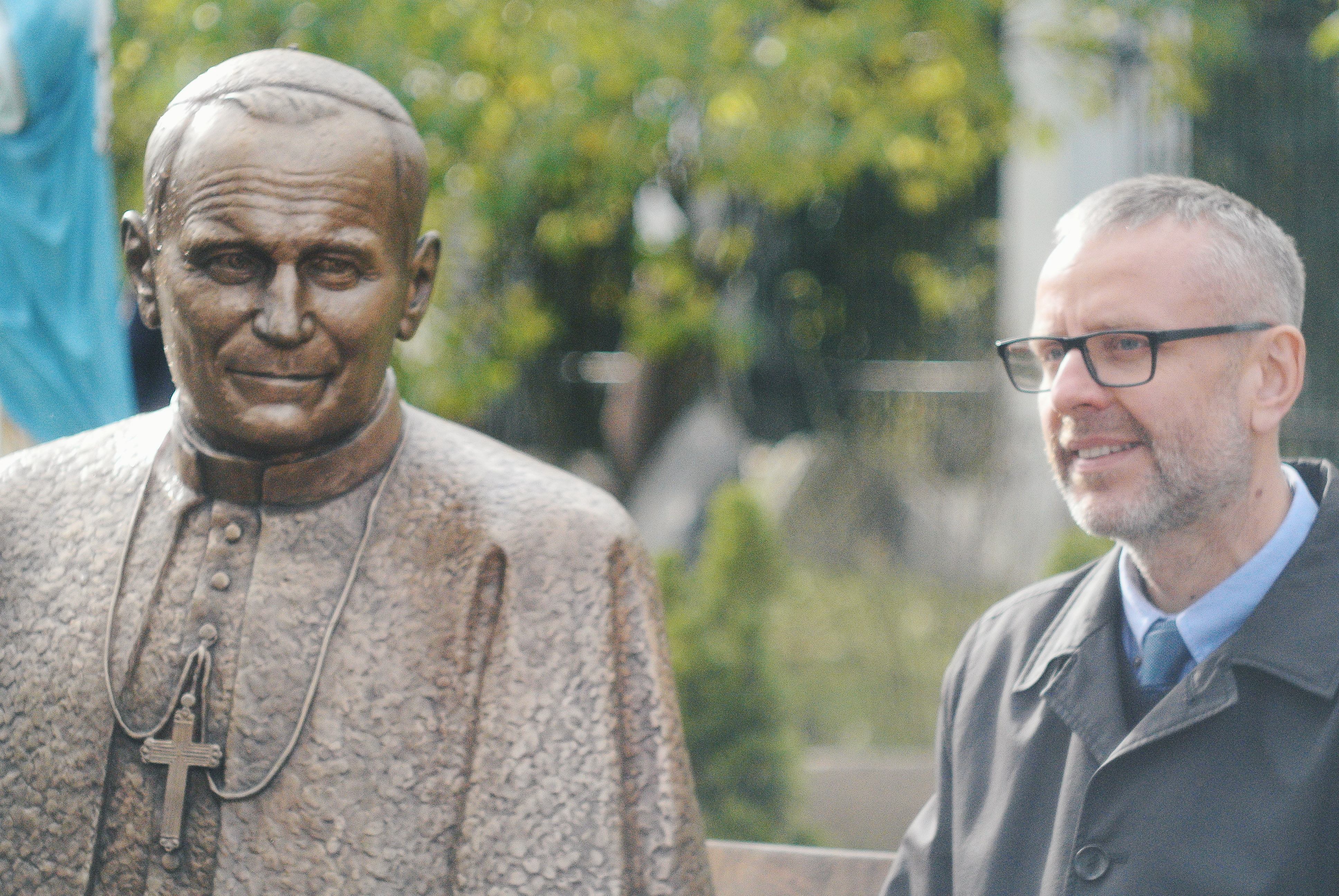 Кс. Юрый звярнуў увагу прысутных на тое, што ініцыятар стварэння фігуры Яна Паўла ІІ Артур Міхальскі, на жаль, цяпер адкліканы з Беларусі, але ён перадаваў сваё цёплае прывітанне праз свайго намесніка Марціна Вайцяхоўскага, які таксама спрычыніўся да справы ўсталявання скульптуры Яна Паўла ІІ: «Калі пасол працаваў у Малдове, з яго ініцыятывы ў Кішынёве была зроблена лавачка з фігураю Яна Паўла ІІ. Прыехаўшы працаваць у Мінск, першай думкай у яго была стварыць падобную лавачку са святым і тут», — адзначыў спадар Марцін і дадаў: «Беларусь цяпер праходзіць праз вельмі цяжкае выпрабаванне, і я перакананы, што святы Ян Павел ІІ нам у гэтай сітуацыі моцна дапамагае, ён побач з намі і моліцца за нас, таму, я ўпэўнены, нам будзе лягчэй перажыць гэты час».