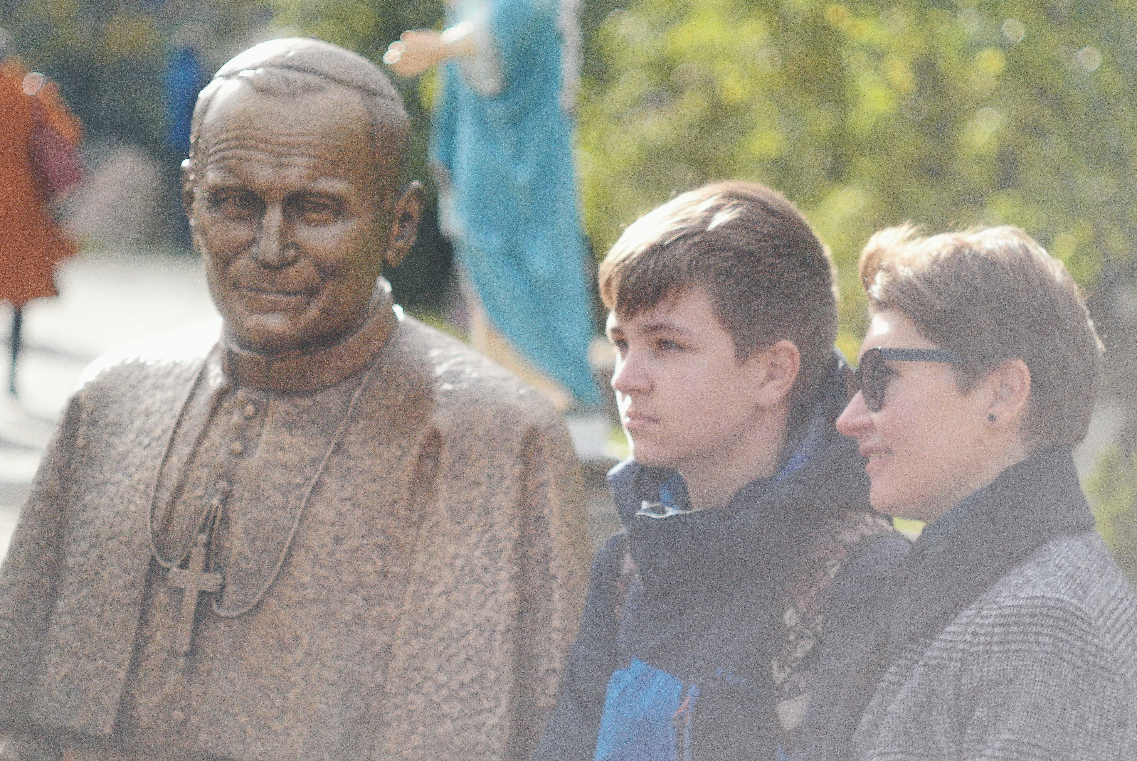 «Скульптура Яна Паўла ІІ была ўсталявана ў юбілейны год гэтага святога, — працягвае кс. Юрый у каментары для часопіса «Ave Maria». — Святы Ян Павел ІІ вельмі блізкі нам чалавек. Ён ведаў нашыя праблемы і тыя ўмовы, у якіх існаваў Касцёл тут, у Беларусі. Дзякуючы яму мы маем нашыя касцёльныя структуры. Ідэю стварэння скульптуры прапанаваў пасол Польшчы Артур Міхальскі. Ён захацеў, каб была ўсталявана менавіта лавачка з фігураю Яна Паўла ІІ, каля якога можна прысесці, памаліцца і нават зрабіць сэлфі. Усё для таго, каб падкрэсліць блізкасць святога Папы да нас. Дарэчы, аўтарам скульптуры Яна Паўла ІІ стаў таксама беларускі творца — Аляксандр Каструкоў.