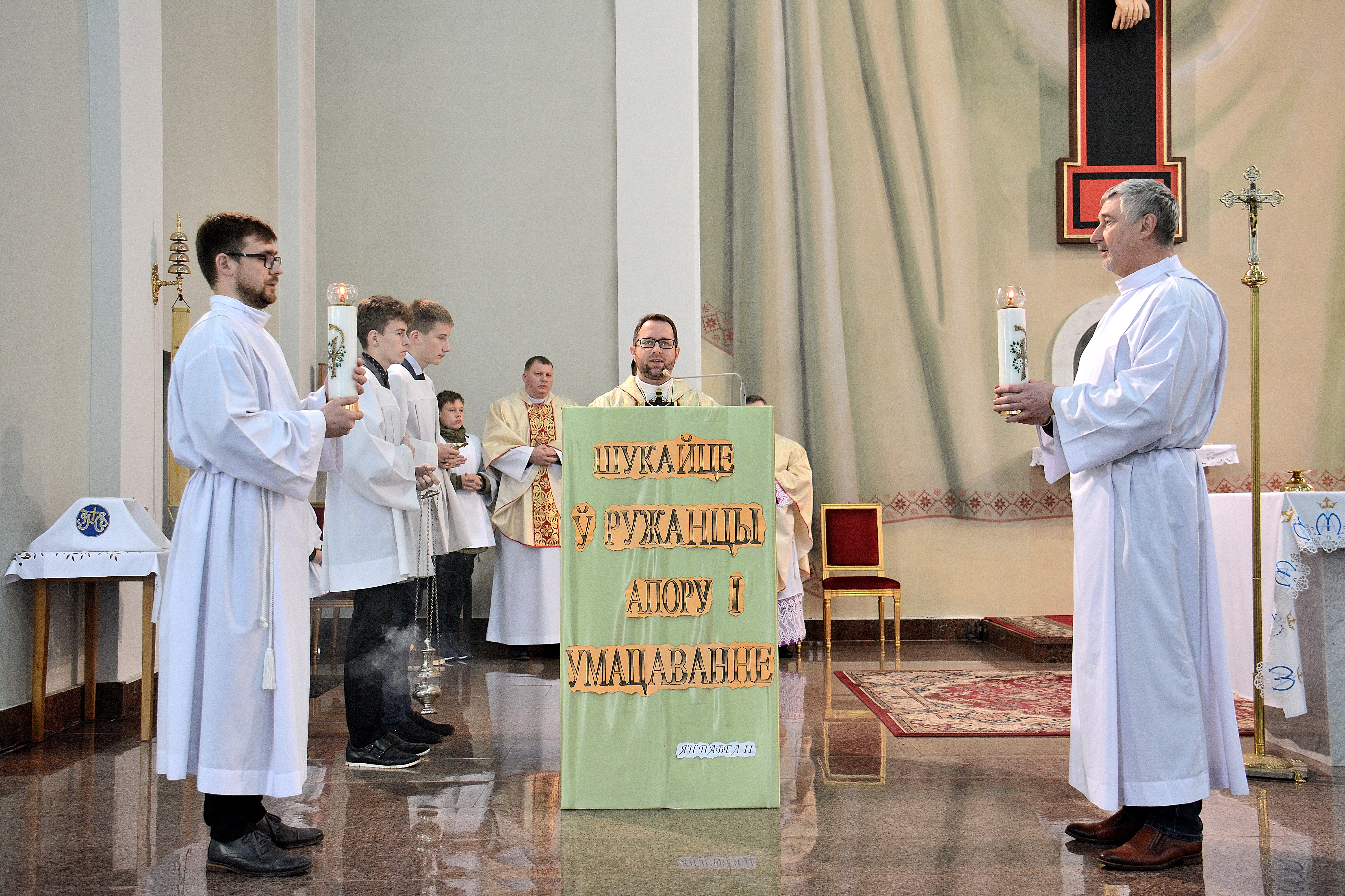 Крыж асвяціў ардынарый Віцебскай дыяцэзіі біскуп Алег Буткевіч. Ён жа цэлебраваў па асвячэнні крыжа і святую Імшу. Казанне прамовіў айцец Анджэй Ядыкоўскі. Сярод інтэнцый, што прагучалі падчас Імшы, была таксама і інтэнцыя аб хутчэйшым вяртанні на радзіму арцыбіскупа Тадэвуша Кандрусевіча. У парафіяльнай урачыстасці ўзялі ўдзел прадстаўнікі дыяцэзіяльнай курыі, а таксама вернікі з іншых парафій горада.