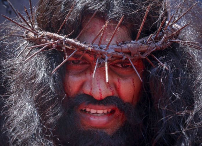 Пілігрым выконвае ролю Езуса Хрыста ў Вялікую пятніцу, несучы крыж па вуліцы Мумбаі,