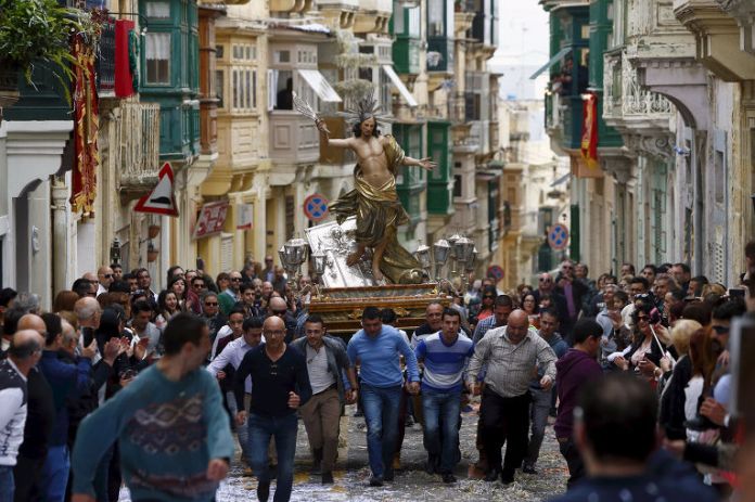 Пасхальная працэсія ў гарадку Каспікуа на Мальце, 5 красавіка 2015 г. Вернікі нясуць па вуліцы фігуру ўваскрослага Хрыста.