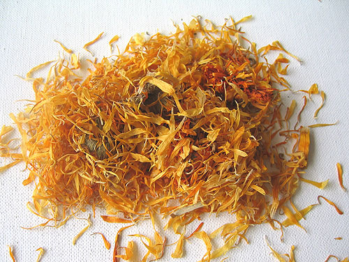 Кветачкі календулы прасушыць на паветры, потым дасушыць у духоўцы, патаўчы, прасеяць і выкарыстоўваць для булёнаў і інш. страваў.