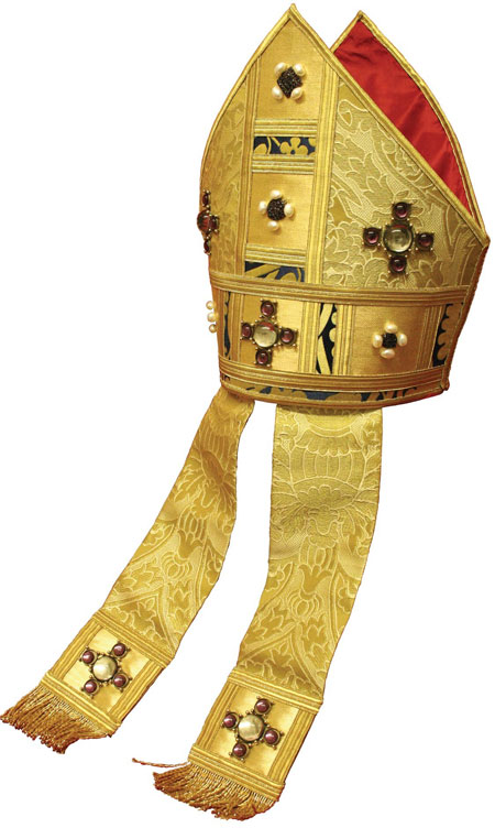Галоўны пасвячаючы біскуп ускладае таксама мітру — сімвал духоўнага шлему, які абараняе біскупа ў барацьбе з ерасямі і памылкамі, што становіцца магчымым дзякуючы веданню абодвух Запаветаў (на іх указваюць пярэдняя і задняя сценкі мітры), а таксама ўменню карыстацца літаральным і духоўным сэнсам Святога Пісання (сімвалам чаго з’яўляюцца стужкі ззаду мітры).