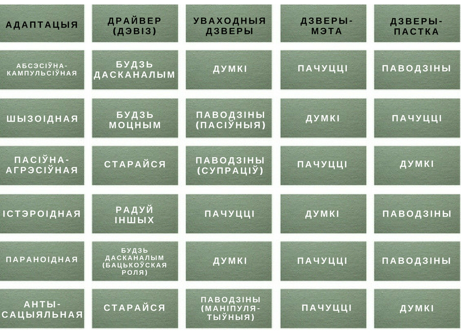 У пошуках вырашэння праблемы я ўзгадаў працу амерыканскіх псіхолагаў В. Джойнса і Я. Сцюарта, якія распрацавалі тэорыю Поля Вэра пра 6 адаптацый — спосабаў чалавека прыстасавацца да рэальных жыццёвых умоваў і сітуацый. Кожная з іх мае свой дэвіз-драйвер. Джойнс і Сцюарт вырашылі, што, паколькі чалавек мае пачуцці, думкі і паводзіны, то і кожны спосаб адаптацыі мае свае «ўваходныя дзверы», праз якія можна наладзіць кантакт. Нешта з’яўляецца «дзвярыма-мэтаю», дзе мы спадзяемся на змены, а нешта — «дзвярыма-пасткаю», якія зачыняюць чалавека ад кантакту.