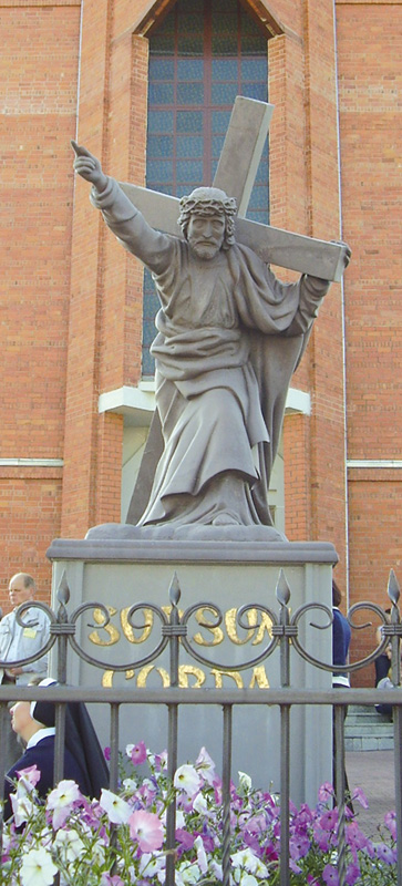 На прыкасцёльным пляцы ў Мастах, што на Гарадзеншчыне, нас, удзельнікаў рэкалекцый з айцом Антанэлам Кадэду, сустрэла вялікая фігура Хрыста, які нясе крыж. Адразу кінулася ў вочы, што Хрыстус хоць і згорблены пад цяжарам сваёй нялёгкай ношы, але Яго твар зусім не напоўнены безнадзейнасцю. Ягоны палец указвае на неба. На пастаменце надпіс : «Sursum corda», што ў перакладзе азначае: «Угору сэрцы!». Дык мы і ўваходзім у касцёл з надзеяй, што рэкалекцыі з айцом Антанэла Кадэду дапамогуць нам узняць угору свае сэрцы.