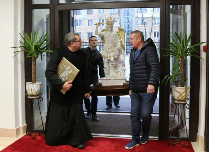 10 лістапада, у суботу, фігура святога арханёла Міхала была перавезена з Кальварыі ў Апостальскую Нунцыятуру. Сустрэў арханёла Міхала Апостальскі Нунцый у Беларусі арцыбіскуп Габар Пінтэр і сёстры назарэтанкі, якія служаць у нунцыятуры. Пасля малітвы перад фігураю мы папрасілі арцыбіскупа адказаць на некаторыя пытанні для часопіса «Ave Maria» (інтэрв’ю з Яго Эксцэленцыяй чытайце ў № 12). На пытанне, ці не лічыць нунцый мэтазгодным, каб перэгрынацыя фігуры арханёла Міхала, мэтаю якой з’яўляецца малітва за Беларусь, адбылася ва ўсіх парафіях нашай краіны, прадстаўнік Папы адказаў: