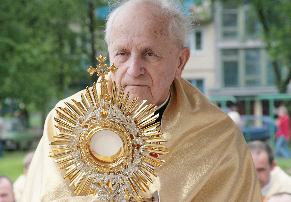 — На адной з сустрэчаў са святарамі Ян Павел ІІ сказаў такія словы: «Галоўная місія святарства заключаецца ў Эўхарыстыі. Ваша і мая самасвядомасць раз і назаўсёды вызначана ў цэлебрацыі Эўхарыстыі». Калі я задумаўся над гэтымі словамі і над тым, што для мяне стаіць на першым плане ў святарстве і што адыгрывае ў ім галоўную ролю, то прыйшоў да высновы, што гэта, відавочна, Эўхарыстыя, святая Імша — святая Камунія і святая эўхарыстычная адарацыя... Прашу мне паверыць: я знешне ўтаймоўваю сябе, каб гэтага не было відаць, але на працягу сямідзесяці гадоў, калі я цэлебрую святую Імшу і пры вымаўленні словаў кансэкрацыі бяру ў рукі Гостыю і келіх, кожны раз у мяне дрыжыць голас, дрыжаць рукі... Бог Айцец дае нам прабачэнне, і чалавецтва збаўляецца. Бяда была б свету, калі б не было святой Імшы! Падчас святой Імшы мне як святару першаму дадзена карыстацца ахвярнымі дарамі, пераўтворанымі ў Цела і Кроў Езуса Хрыста. Які прывілей! А як жа міла адараваць «Вязня Любові» (гэта маё любімае азначэнне), прысутнага ў Касцёле ў табэрнакулюме! Падчас адарацыі я не размаўляю, у мяне проста няма словаў... Я кленчу, гляджу на табэрнакулюм — і са мною на свой Боскі лад размаўляе Езус Хрыстус. Гэта падобна да таго, што было са мною ў шасцігадовым узросце, у тым згаданым эпізодзе. Толькі яно паўтараецца, паўтараецца і паўтараецца... Я перакананы, што, калі настане канец майго жыцця, гэта будзе апошні акт падобнай сустрэчы з Богам.