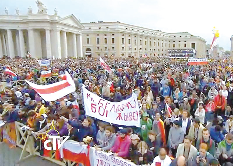 Без вялікіх цяжкасцяў міласэрны Бог прывёў семярых «звар’яцелых» беларусаў на плошчу, прычым размясціў Ён нас акурат насупраць адной з відэакамераў, з якой вялася трансляцыя святой Імшы. Мы разгарнулі загадзя падрыхтаваны банер са словамі «На Беларусі Бог жыве!». Для нас гэта сапраўды было свята Божай Міласэрнасці! Калі пасля завяршэння ўрачыстай святой Імшы мы ўбачыліся з астатнімі нашымі пілігрымамі, усе ў захапленні пачалі нас віншаваць. Мы не адразу зразумелі, чаму да нас столькі ўвагі, але пасля нам патлумачылі, што было неверагодна прыемна бачыць нас падчас відэатрансляцыі, прычым буйным планам і з гэтай праўдай у руках, што сапраўды «На Беларусі Бог жыве!». І тады зноў успомніліся словы Фрэнка Дафа пра тое, што «Пан Бог заўсёды падтрымае сваё нямоглае дзіця ў любым добрым пачынанні, нават калі для гэтага спатрэбіцца цуд»...