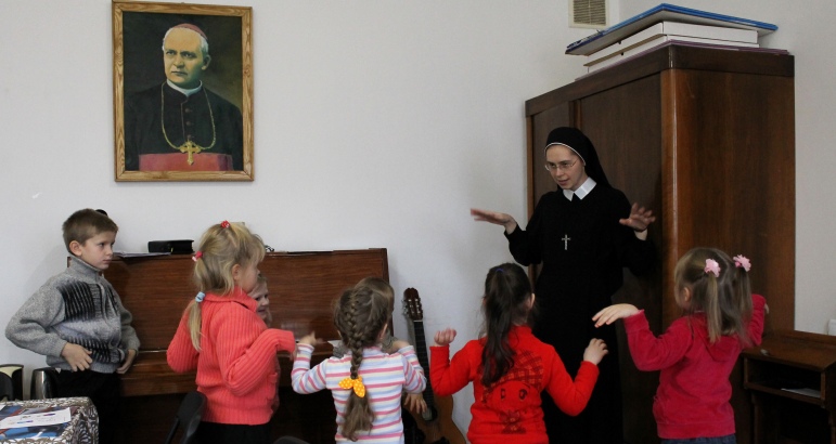 Тым часам у доме сясцёр ужо распачынаюцца заняткі дзіцячага садка, куды кожную нядзелю на працягу года прыходзяць дзеткі ад 4 да 8 гадоў. Праводзіць заняткі сястра Таццяна. Пакуль я наведвала катэхезу, дашкаляты ўжо даведаліся, чаму трэба слухаць бацькоў, і ціха-мірна размалёўвалі прыгожыя карцінкі.