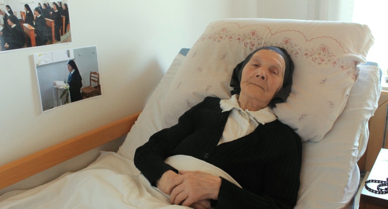 Тым часам сястра Антаніна Багдановіч ужо згатавала абед і чакае, каб яго раздаць. А пакуль запрашае мяне схадзіць разам да сястры Галіны (Алены Гарошкі). Законніцы ўжо 96 і яна з-за хваробы ўвесь час ляжыць у ложку. На жаль, яна практычна не чуе, але сястра Рэгіна прадстаўляе ёй мяне.