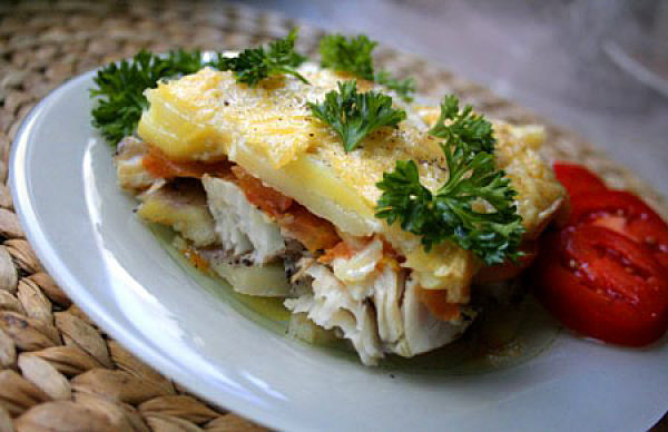 У форму для запякання (папярэдне змазаць алеем) выкласці палову бульбы. Пасаліць, паперчыць. На бульбу пакласці рыбу. На рыбу выкласці памідоры. На памідоры выкласці бульбу, якая засталася, крыху пасаліць. Бульбу змазаць маянэзам. Пасыпаць сырам і паставіць у духоўку.