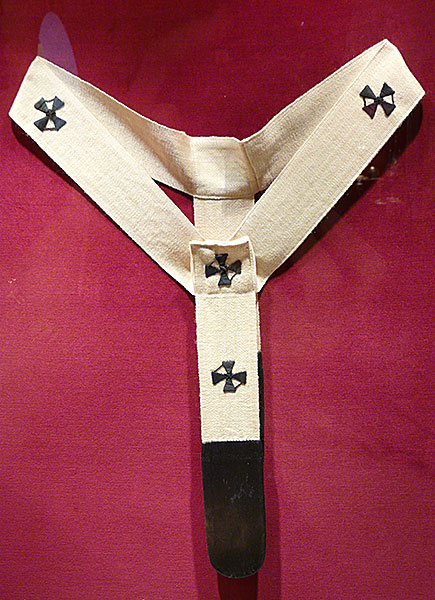 Арцыбіскупскі палій — гэта шырокая стужка, якая надзяваецца вакол шыі і два канцы якой звісаюць на плечы і грудзі. Ён аздоблены шасцю крыжыкамі, вытканымі з чорнай воўны.